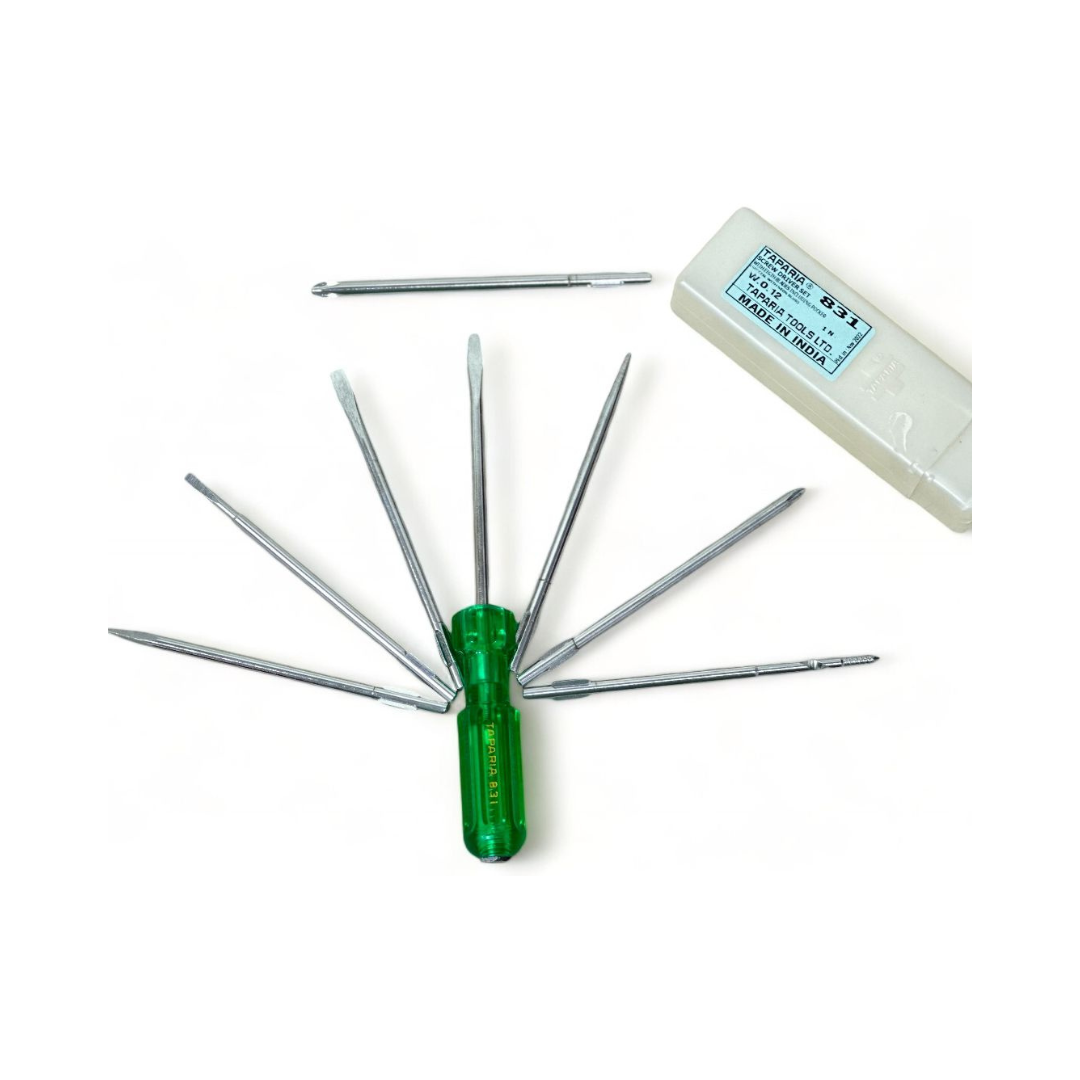 The Taparia Screwdriver Set 9pcs - 831 features a blade made from Silicon-Manganese steel with 55-58 HRC hardness on the tip, providing superior wear resistance and torque requirement. The blade tip is magnetised, allowing you to lift small screws from confined spaces. Set includes 3.5 x 0.5, 4.3 x 0.6, 6 x 0.8, and different sized Philips screwdrivers, as well as a wooden screw type.